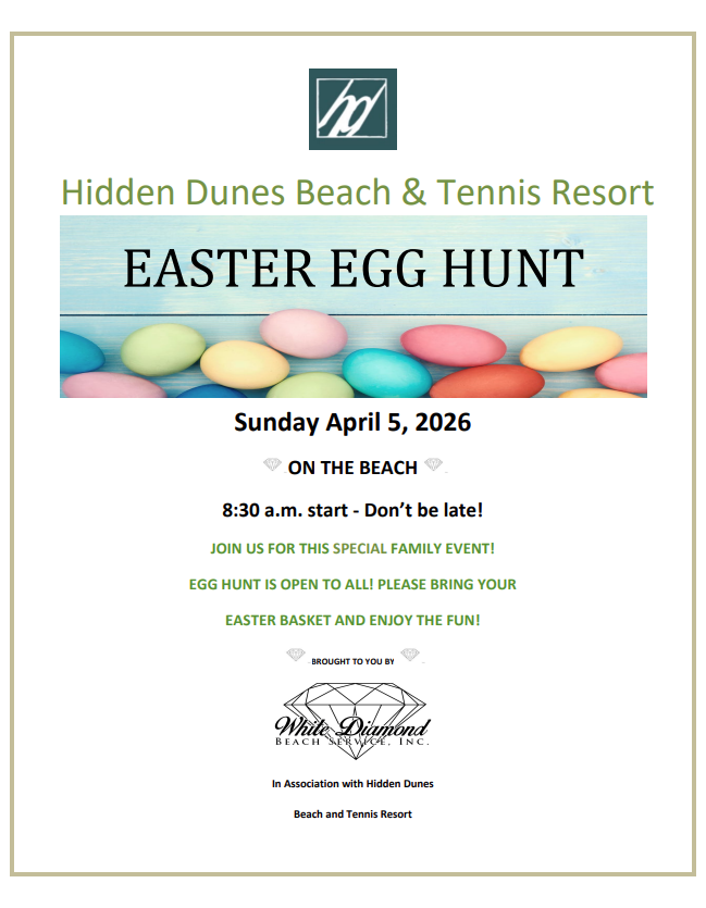 You're invited to join us on the beach Easter Sunday for our annual Easter Egg Hunt! Celebrate Easter on the sugar-white sands of the Emerald Coast, head down to the beach on Easter Sunday at 8:30 AM and enjoy our family-friendly easter egg hunt at Hidden Dunes Resort hosted by White Diamond Beach Service. Don't forget to bring an basket or bag to collect your goodies!